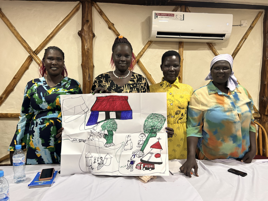 Survivors from protection of civilians (POC) sites and internally displaced persons (IDP) camps take part in a participatory drawing exercise during a workshop on education as reparation in Juba. South Sudan, November 2025. GSF.