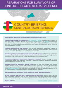 REPARATIONS FOR SURVIVORS OF CONFLICT-RELATED SEXUAL VIOLENCE COUNTRY BRIEFING: CENTRAL AFRICAN REPUBLIC Official Register of Survivors of conflict-related sexual violence (CRSV ): None. Commonly cited number of CRSV Survivors: ICC Prosecutor v. Bemba referred to 5,829 victims of the 2002-2003 conflict, nearly half of whom are survivors of sexual violence.…