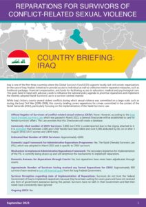 REPARATIONS FOR SURVIVORS OF CONFLICT-RELATED SEXUAL VIOLENCE COUNTRY BRIEFING: IRAQ Official Register of Survivors of conflict-related sexual violence (CRSV ): None. However, according to the Iraqi Yazidi [Female] Survivors Law , which was passed in March 2021, a General Directorate will be established to care for female survivors' affairs. The…